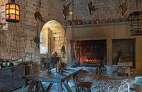 een oude middeleeuwse keuken met een open haard met daarboven een pot en dode fazanten en eenden van de jacht op het plafond