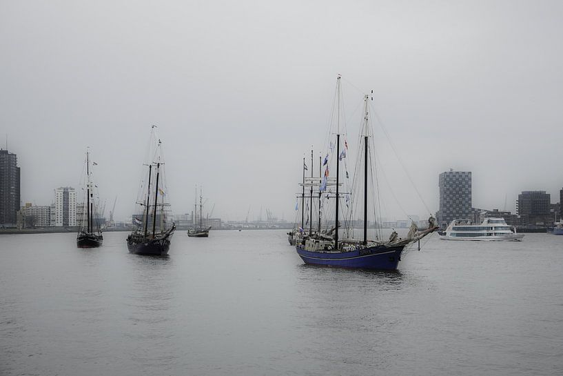 oude zeilschepen varen voorbij op de maas, richting de erasmusbrug
