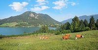 meer de schliersee met bergen en grazende koeien op de weide. idyllisch panorama landschap hoog bavaria.