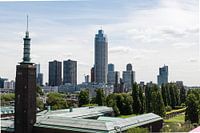 de skyline van de stad rotterdam in nederland met veel groen en de zalmhaventoren, de hoogste toren in nederland op een zomerdag met blauwe lucht en wolken