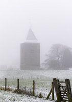 portret van de oude toren van Heteren , Gelderland, langs de Rijn, in een winters landschap, met een besneeuwd grasveld en mist in de lucht