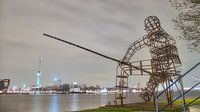 zittend op de Maasboulevard met uitzicht op de stad de vissende man. een kunstwerk van ...