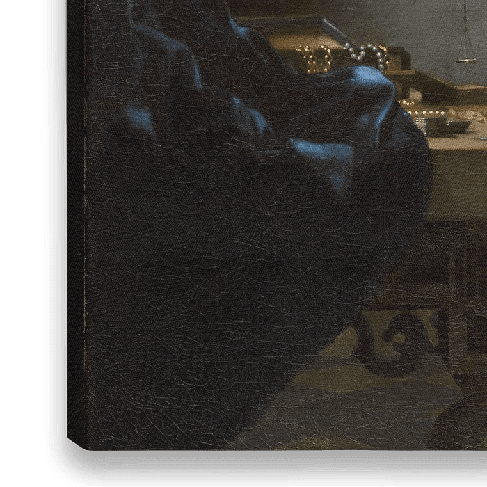 Koop de vrouw met de weegschaal, Johannes Vermeer als reproductie op canvas, aluminium dibond, (ingelijste) fotoprint, behang en ArtFrame, op maat geprint in Fine-Art kwaliteit.