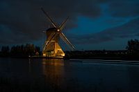 deze prachtige windmolens in Kinderdijk worden verlicht met wit licht op het blauwe uur