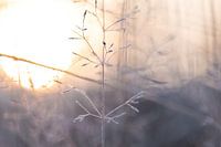 close up van een delicaat fijn wild plantje, met een prachtige pastelroze koude zonsopkomst op de achtergrond