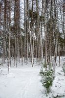 De winter doet zijn best om het dennenbos te bedekken met sneeuw. Dat is al lang geleden in Holland.