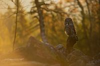 Great Grey Owl / Bartkauz ( Strix nebulosa ) in its typical environment, perched on a rock in first morning light, at daybreak, warm colors.