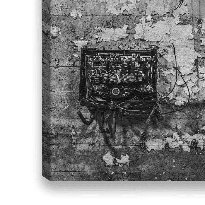 Een foto in zwartwit van oude bekabeling voor stroom in een verlaten fabriek aan een vervallen muur met afgebladerde verf.