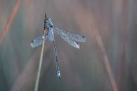close up van een waterjuffer, helemaal bedekt met dauwdruppels, die er als diamantjes uitzien in de ochtendzon