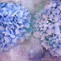De artistiek vormgegeven afbeelding toont twee prachtige hortensiabloemen die schitteren in zachte blauwe en delicate violette tinten. De fijne bloemblaadjes lijken bijna transparant en zijn voorzien van delicate schakeringen die ze diepte en levendigheid geven. Het koele blauw gaat harmonieus over in een mysterieus violet, waardoor een…