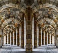 Een monumentale, symmetrische arcade van massief steen die indruk maakt met zijn geometrische precisie en diepte. De bogen, die worden ondersteund door robuuste pilaren, reiken tot in de verte en creëren een indrukwekkend perspectief dat de kijker diep het beeld in trekt. De stenen bogen zijn geschilderd in verschillende aardetinten,…