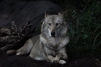 directe strenge blik van een strenge vrouwelijke wolf zittend in het midden van het frame, symmetrische compositie in een zomers bos, mooie pose