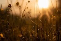 close up van een weide vol met boterbloemen en wildgroei, met de opkomende zon op de achtergrond, wat voor een moody sfeer zorgt