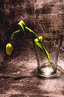 Een tulp in een vaas , bijna op het einde van haar korte leven als snijbloem . Een korte tijd mocht ze een plaats opfleuren , nu is ze nog een schim van zichzelf .