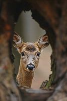 Een betoverend moment vastgelegd in een adembenemende foto. Een jonge ree, met zijn zachte bruine vacht en nieuwsgierige ogen, kijkt recht in de lens vanuit een natuurlijke omlijsting van verweerd hout. De compositie van licht en schaduw creëert een gevoel van mysterie en verwondering, waardoor je je verbonden voelt met de schoonheid…