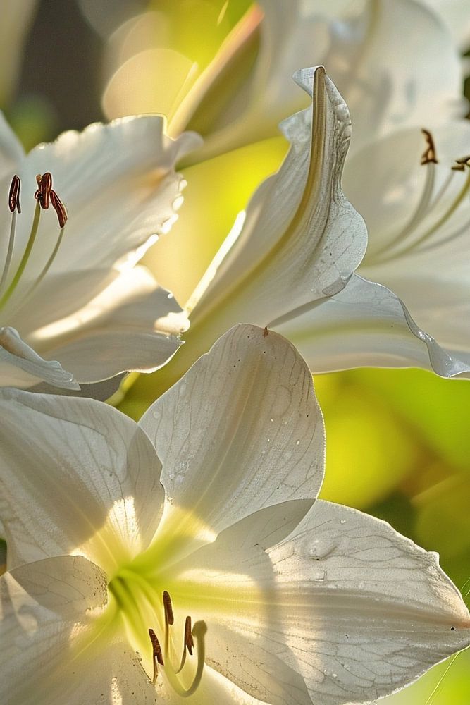 Deze prachtige afbeelding vangt de delicate schoonheid van witte lelies in het warme licht van de zomerzon. De zachte, fluweelachtige textuur van de bloemblaadjes contrasteert prachtig met het donkergroene blad en de verweerde boomschors op de achtergrond. Een ragfijn spinnenweb voegt een vleugje mysterie toe aan de compositie, terwijl de bokeh-effecten in de achtergrond een dromerige sfeer creëren. Dit kunstwerk brengt een gevoel van rust en sereniteit in elke ruimte.