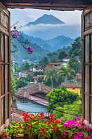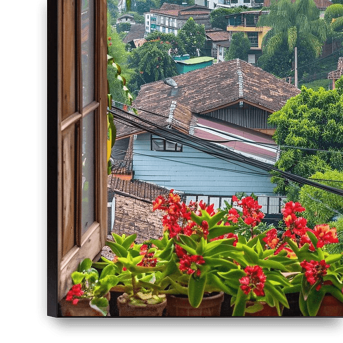 Dit adembenemende landschap, vastgelegd door een raamkozijn, toont de schoonheid van de natuur en de architectuur. Een slapende vulkaan torent hoog boven een schilderachtig dorpje uit, waar kleurrijke huizen zich nestelen tussen weelderig groen. De warme tinten van de bloemen op de voorgrond contrasteren prachtig met het koele blauw van…