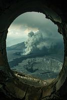 Dit adembenemende kunstwerk legt de rauwe kracht en majestueuze schoonheid van een vulkaanuitbarsting vast. Vanuit een uniek perspectief, alsof je door een venster in de tijd kijkt, zie je de rookpluim oprijzen uit de krater, omringd door een dramatisch landschap van gestolde lava en ruige rotsformaties. De subtiele kleurschakeringen en…