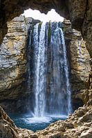 Laat de schoonheid van de natuur je huis binnenstromen met deze adembenemende fotoprint. Een verborgen waterval, omlijst door een natuurlijk rotsvenster, vormt een betoverend schouwspel. Het heldere water stort zich naar beneden, omgeven door weelderig groen en ruwe rotsformaties. De kleuren spatten van de print, van het diepe blauw van het water tot het levendige groen van de vegetatie. Deze print brengt een gevoel van rust en sereniteit in elke ruimte, waardoor je elke dag kunt ontsnappen naar de wonderen van de natuur.