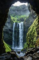 Ontdek de verborgen schoonheid van de natuur met deze adembenemende foto. Een majestueuze waterval stort zich door een smalle opening in een rotswand, omgeven door weelderig groen mos en ruige rotsformaties. Het contrast tussen het donkere gesteente en het heldere water creëert een dramatisch effect, terwijl de zachte mist een gevoel…