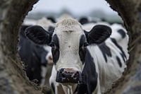 Een zwart-wit portret van een nieuwsgierige koe, omlijst door een modderige cirkel. Haar zachte ogen en vochtige neus contrasteren prachtig met de rauwe textuur van de modder. Een minimalistisch kunstwerk dat rust en verwondering uitstraalt, perfect voor een moderne, landelijke of industriële inrichting.