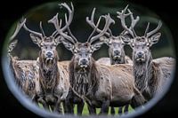 Een adembenemende blik op een groep majestueuze herten, vastgelegd in een moment van serene kracht. Hun imposante geweien steken af tegen de dichte, groene achtergrond van het bos, terwijl hun waakzame ogen de toeschouwer rechtstreeks aankijken. Dit kunstwerk straalt een gevoel van rust en verbondenheid met de natuur uit, perfect om een…