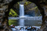 Dit prachtige kunstwerk vangt de serene schoonheid van een verborgen waterval, omgeven door ruige rotsen en mos. Het water stroomt zachtjes neer in een kristalhelder bassin, waarbij de natuur zijn ongerepte rust uitstraalt. De compositie is gefotografeerd door een natuurlijk gevormde opening, wat een uniek perspectief creëert dat de…