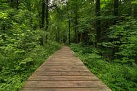Vlonderpad kronkelt zich een weg tussen de groene bomen. Een doorkijkje zeer geschikt voor op een tuinposter. Locatie: Mullerthal Luxemburg