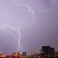 Onweersbui boven Zaandam. Inslagen in het centrum. Op de voorgrond de nieuwe Bernardbrug over de Zaan.