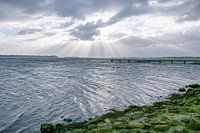 Stilte voor de storm. De zon prikt haar stralen door de donkere wolken boven het Veerse Meer