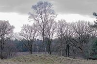 winterlandschap op de heide, op een bewolkte ochtend, met enkele bomen die op een kleine heuvel staan