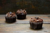 drie chocoladecupcakes met cacaobotercrème op donker hout, een is in focus, kopieerruimte, smalle scherptediepte