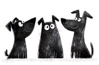 Een poster toont drie speelse honden in een Disney-stijl, in zwart-wit lijnen getekend. Elk hondje heeft expressieve gezichten en grote, schattige ogen, typisch voor de Disney-animaties. De honden hebben vrolijke, dynamische poses: eentje springt, een ander kwispelt enthousiast en de derde zit met een ondeugende blik. De contouren zijn…