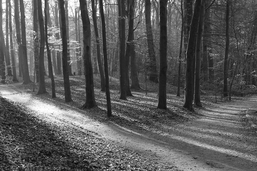 een zwart-wit foto van bomen met licht dat langs het pad binnenvalt