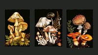 Haal de herfst in huis met deze mooie drieluik van verschillende soorten paddestoelen met zwarte achtergrond.