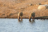 Ze zijn mooi van lelijkheid, de Hyena. Maar zo ontzettend sterk. Hun kaken gaan overal dwars doorheen. Zeker wanneer ze als groep samenwerken zijn ze menig ander dier de baas. Hier zijn 2 hyena's aan het drinken in een waterpoel. Gelijk zijn andere dieren gevlucht.