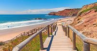 promenade naar beneden naar dromerig atlantisch strand Amado, surfspot aan de algarve kust, portugal. kleurrijke zandkliffen bij carrapateira, costa vicentina.