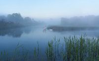 nog voor zonsopkomst tijdens een mistige vroege ochtend deze 2 Knobbelzwanen vastgelegd, waarvan 1 zwaan zijn/haar vleugels even spreidde. Gemaakt in het prachtige natuurgebied Amsterdamse Waterleidingduinen.