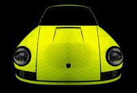 Een oude sportwagen, kunstig digitaal vervreemd, wordt een dynamische metgezel door kleur en vorm. De auto verschijnt in verschillende, levendig vervormde kleuren, felgeel, elke versie overgoten met abstracte patronen en digitale textuur. De klassieke lijnen van de auto zijn gedeeltelijk vervormd, uitgerekt of gefragmenteerd, terwijl de kleuren naadloos in elkaar overvloeien, waardoor het beeld een futuristische, surrealistische esthetiek krijgt. De sportwagen wordt zo een symbool van beweging, snelheid en tijdloosheid, zwevend tussen realiteit en digitale fantasie.