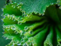 heldere druppels op een plant genaamd de vrouwenmantel, de druppels blijven mooi liggen op deze plant omdat er zachte haartjes op de bladeren zit.