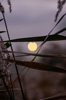 Druppels water hangen op een blad van riet. De zachte tinten en wazige licht vangen de fragiele rust van een winterse ochtend. Natuur ademt.