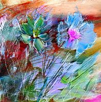 Bloemenschilderij in acrylverf en grafische elementen. Een kleurrijk en expressief beeld voor de woonruimte. Het straalt optimisme en vrolijkheid uit.