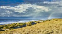 Vanuit Noord-Holland strekken de duinen met de zeereep zich majestueus uit langs de kust. Hier, waar land en zee elkaar omhelzen, ontvouwt zich soms een wonderlijke verschijning. Onder een dreigende lucht verschijnt plotseling een regenboog, als een brug tussen hemel en aarde. De kleuren stralen helder af tegen het grijze decor, een…