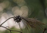 close up van een dennenappel, die nog bevestigd is aan de dennetak, met een donkere bokeh achtergrond