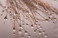 close up van een pluk paardenhaar aan de prikkeldraad, helemaal bedekt met hopen dauwdruppels