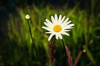 Een zeer veel voorkomende wilde plant, namelijk de margriet met zijn opvallende gele hart in het midden van de bloem.