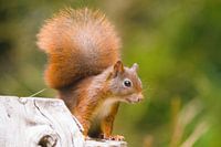 De eekhoorn is een van de meest aaibare dieren. De guitige kop, de grote pluimstaart en de grote glanzende ogen. Hier op een oude stronk.