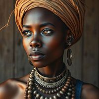 een portret van een Afrikaanse vrouw met oker bruin omslagdoek en traditioneel authentieke zilver sieraden en kralen.