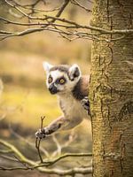 een ringstaart maki de vanachter een boom zit te gleuren wat er verderop gebeurt.