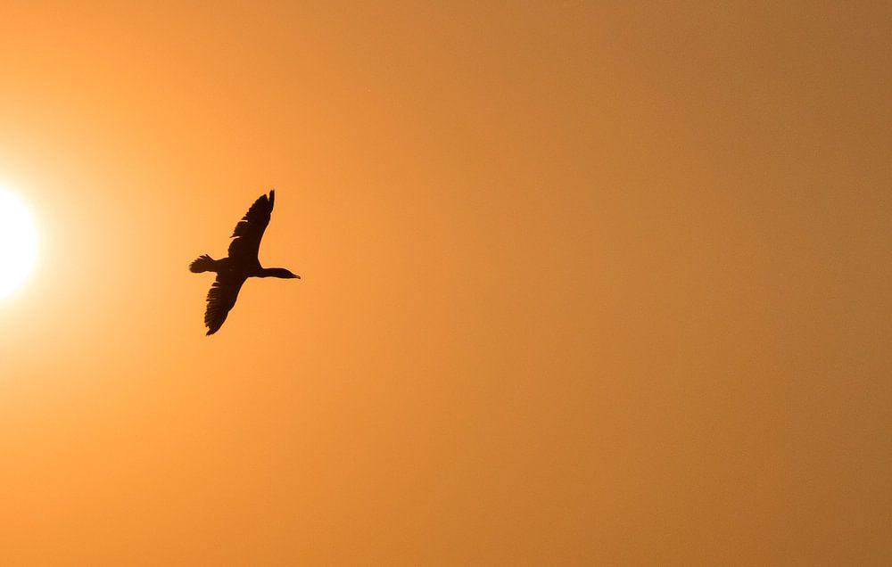 een aalscholver tijdens zonsondergang